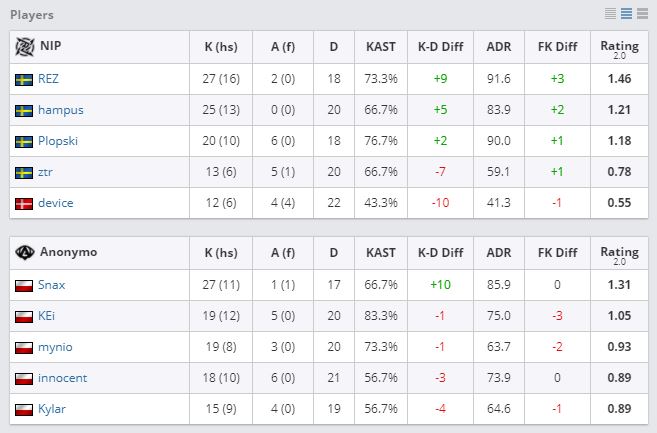 MVP i matchen var REZ som hade allra flest kills (tillsammans med Snax i Anonymo) på 27 stycken. REZ hade även högst skada per runda på 91.6. Men även Hampus bör nämnas som stod för hela 6 entry frags under matchen. Nyförvärvet device kom aldrig riktigt in i matchserien men det visar också vilket enorm sparkapital NiP sitter på efter denna matchen.
