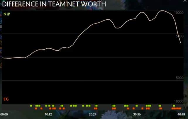 Svenske s4 spelade Sand King och stod för en bra insats där han kunde sätta upp kills och vara nyttig i team fights. När EG’s Arteezy till slut hade fått tillräckligt många items kunde NiP inte längre stå emot utan deras ancient föll.