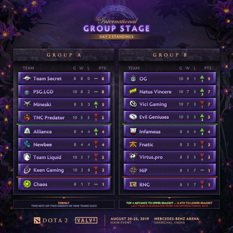 Team Secret toppar gruppet tillsammans med PSG.LGD på 8 poäng men det kinesiska laget har spelat en match mer än vad Team Secret gjort. De båda lagen möts under dag tre i en gruppfinal.